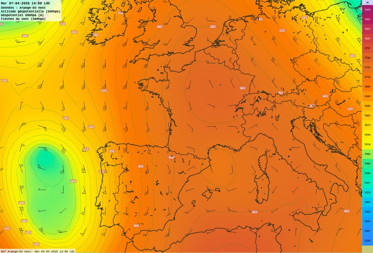 | Altitude géopotentielle (500hpa) | 5657 m | 5689 m | 5720 m | 5731 m | 5754 m | 5756 m | 5761 m | 5751 m | 5765 m | 5766 m | 5769 m | 5757 m | 5762 m | 5760 m | 5756 m | 5744 m | 5746 m | 5741 m | 5740 m |